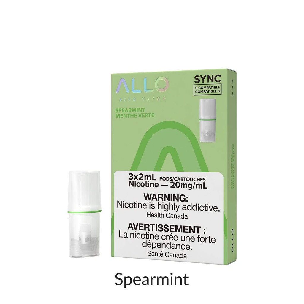 Spearmint by ALLO Sync is a vape pod product that includes the flavor of spearmint. The packaging contains three pods, each with a capacity of 2mL. This product is intended for use by adult consumers only.