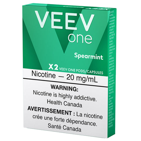 Spearmint by VEEV One Pod consists of flavors that include Spearmint. The product is packaged in two vape pods, each containing 2 mL of liquid. It is intended for use by adult consumers only.